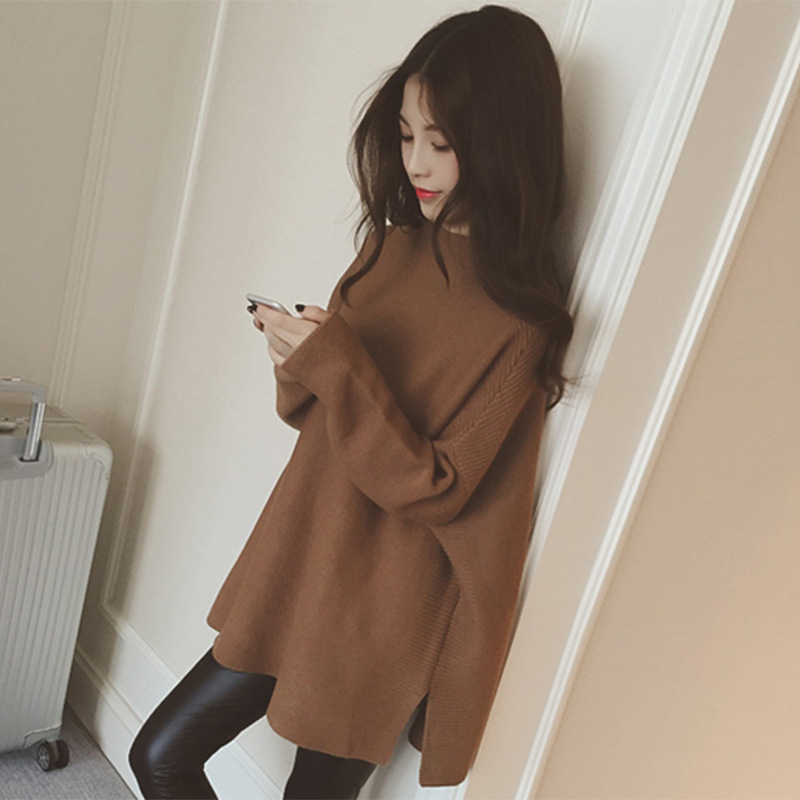 2015新款韓版下擺開叉時尚半高領(lǐng)寬松套頭針織衫中長款長袖毛衣女 /