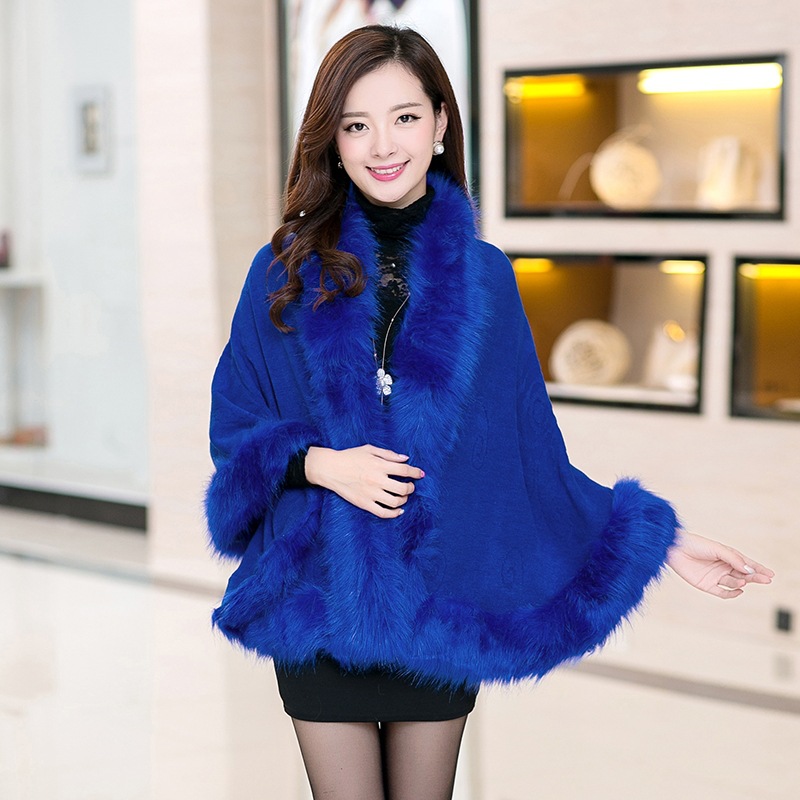 秋冬新款毛領(lǐng)大碼披肩斗篷外套開衫針織歐美仿狐貍毛仿皮草羊毛衫 /