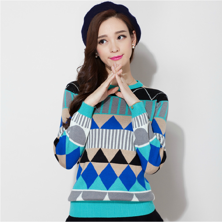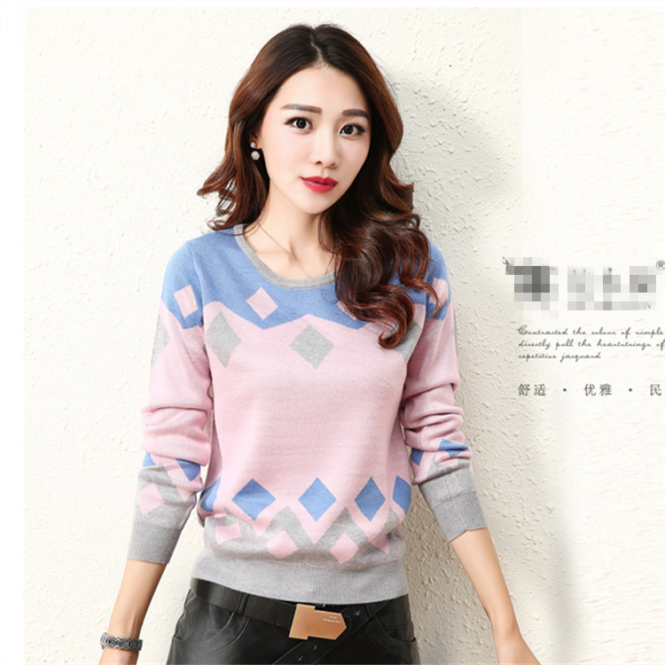 秋裝新款幾何圖案套頭女毛衣加厚款圓領(lǐng)寬松打底針織衫外套批發(fā) /
