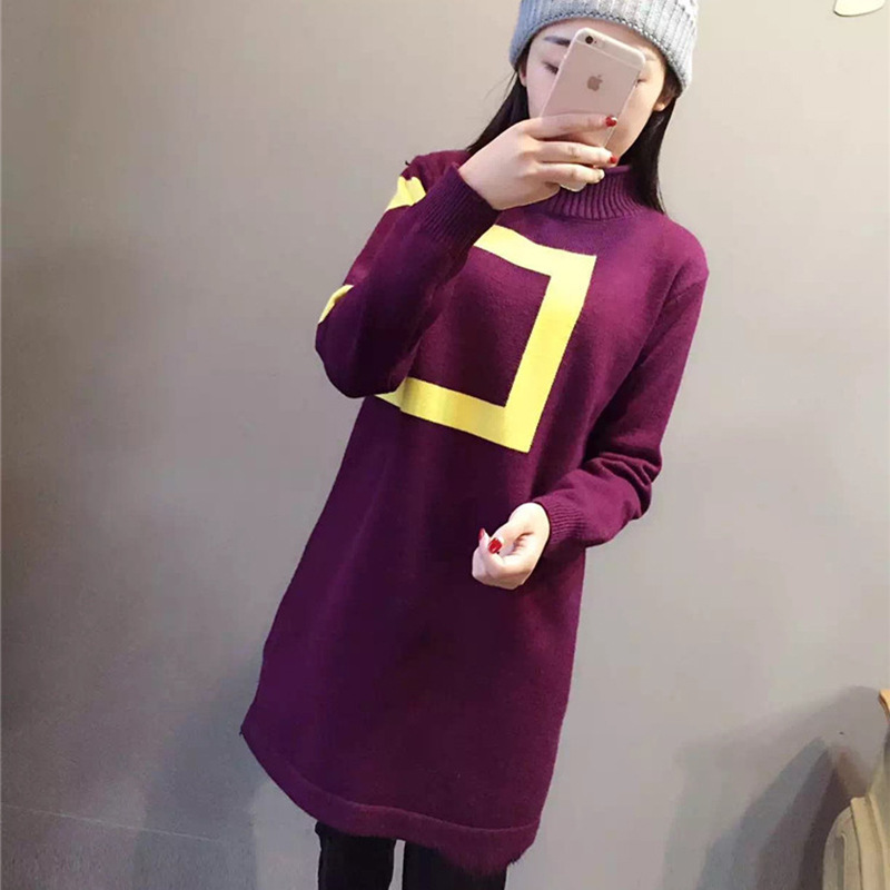 韓版時尚高領(lǐng)長袖拼色幾何女式針織套頭中長款毛衣女秋冬大碼女裝 /