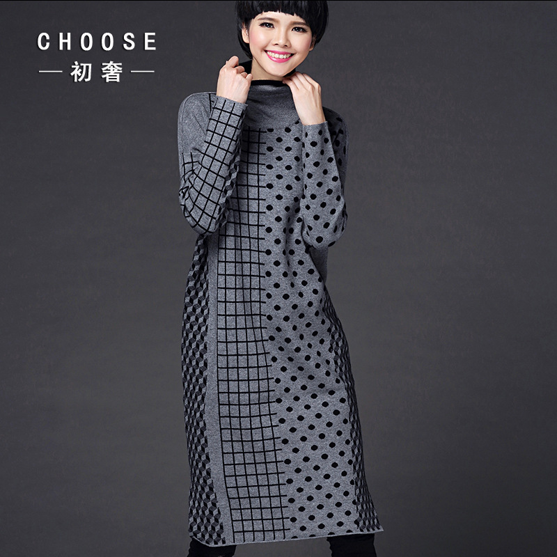 工廠直銷 秋冬新款女式寬松中長款高領(lǐng)毛衣女 長袖波點針織連衣裙 /