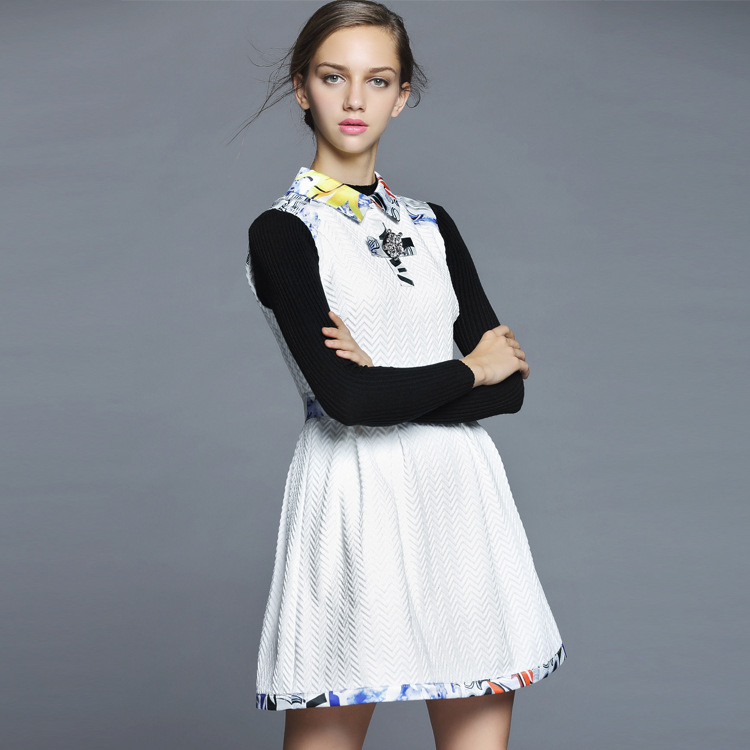 歐洲站2015冬裝新款圓領(lǐng)拉鏈長袖刺繡收腰修身連衣裙打底裙 /