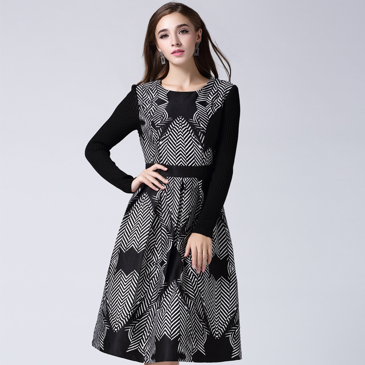 歐洲站2015冬裝新款圓領(lǐng)針織長袖黑白條紋收腰修身連衣裙打底裙 /