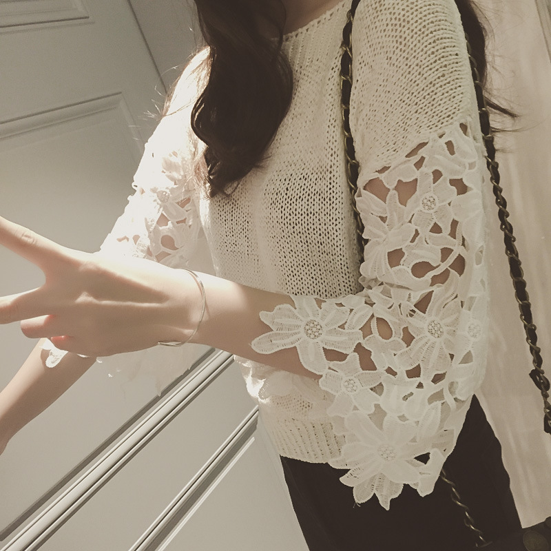 2015夏季新款 韓國東大門韓版拼接鏤空鉤花袖薄款套頭針織衫上衣 /