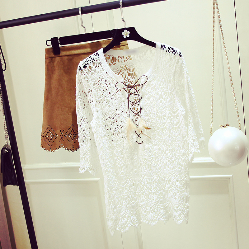 秋裝新款2015韓版寬松鏤空蕾絲衫中袖透視衫時(shí)尚系繩罩衫女裝 /