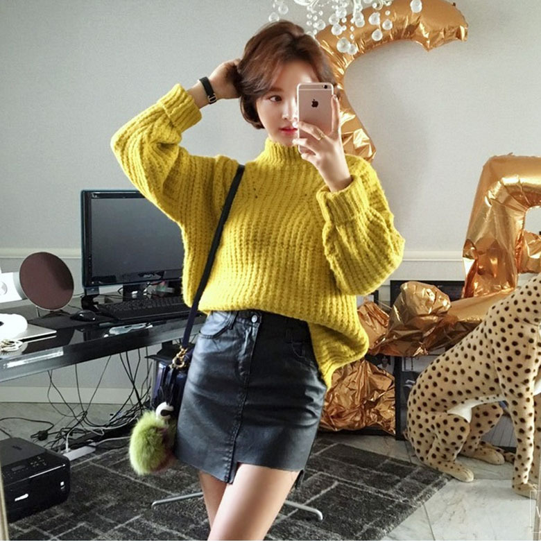 東大門代購 2015秋冬新款氣質(zhì)套裝 寬松高領(lǐng)毛衣+PU皮裙兩件套裝 /