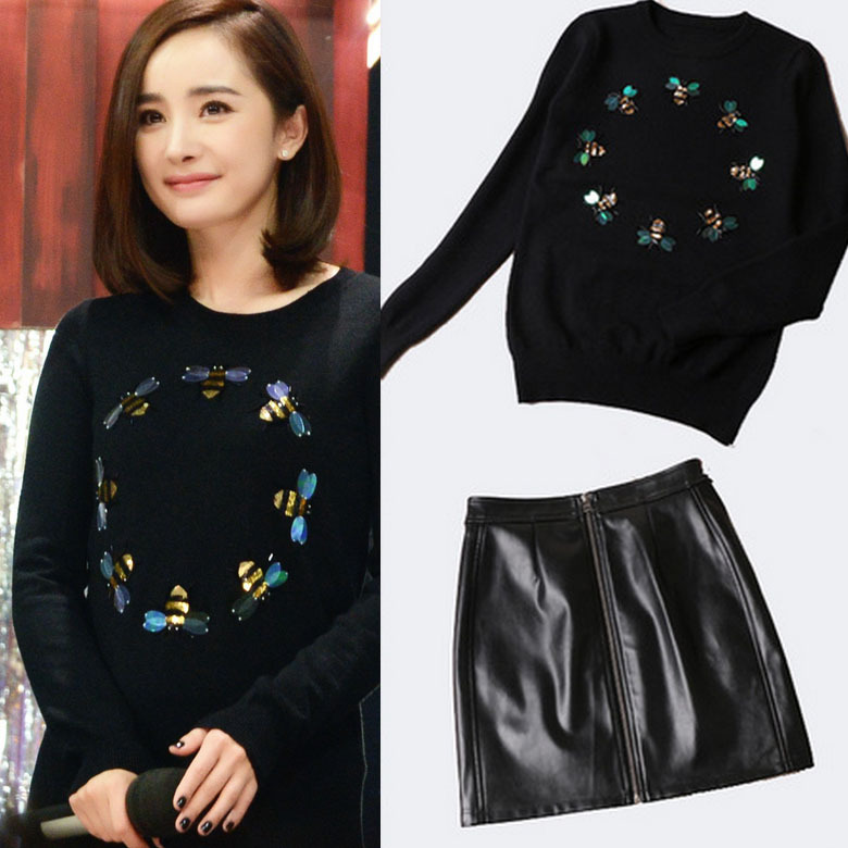 楊冪同款套裝女2015秋冬新款高端定制手工釘珠毛衣+水洗皮裙套裝 /