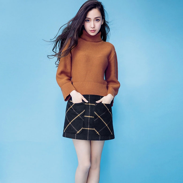 明星楊穎同款套裝女 2015秋冬新款氣質(zhì)高領(lǐng)毛衣+格紋毛呢包臀短裙 /