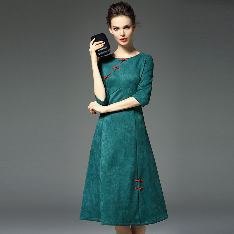 liuvia 歐洲站2015冬季新款女裝 雞皮絨純色拼接七分袖復(fù)古連衣裙 /