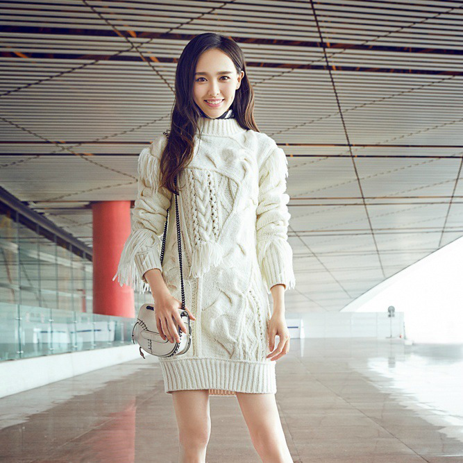 唐嫣明星同款機(jī)場2015秋冬連衣裙韓版寬松長款毛衣裙女套頭流蘇潮 /