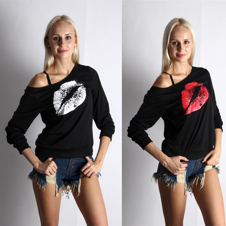 速賣通ebay新款長袖秋裝衛(wèi)衣T恤紅唇大嘴唇圖案斜肩性感女裝上 /