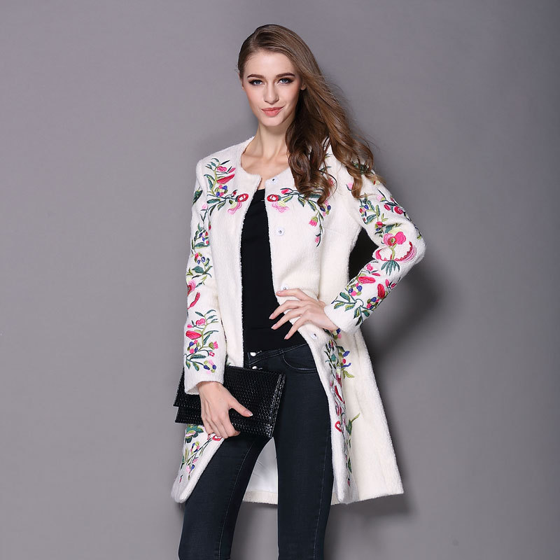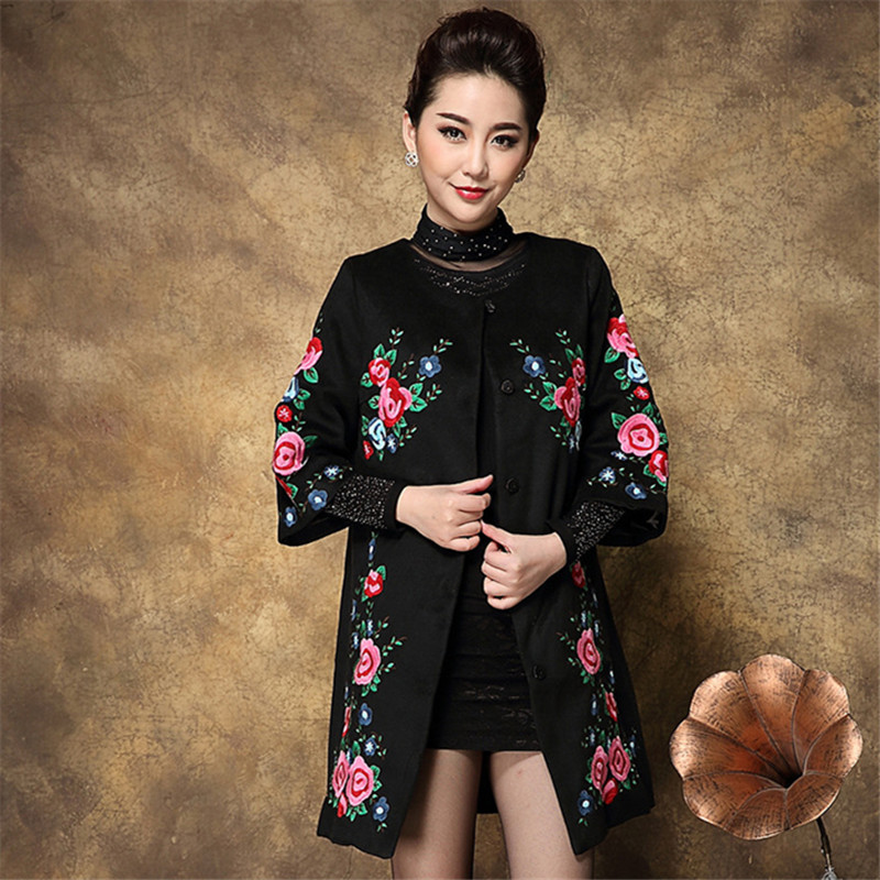 2015秋冬新款民族風(fēng)繡花女裝 刺繡時尚大碼羊毛呢子大衣外套批發(fā) /