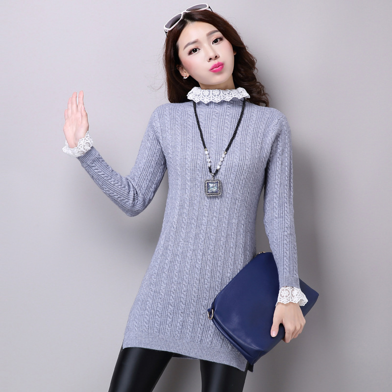 2015冬季新品女裝時尚百搭顯瘦中長款蕾絲花邊針織衫女 /