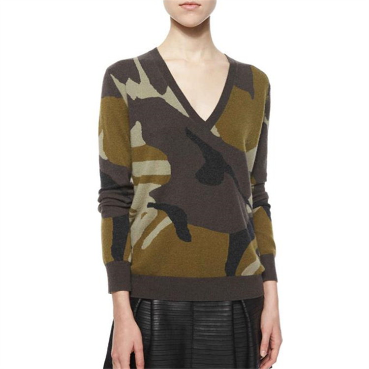 廠家直銷 2015歐美站女裝嵌花迷彩V領(lǐng)羊絨衫長(zhǎng)袖純山羊絨套頭毛衣 /