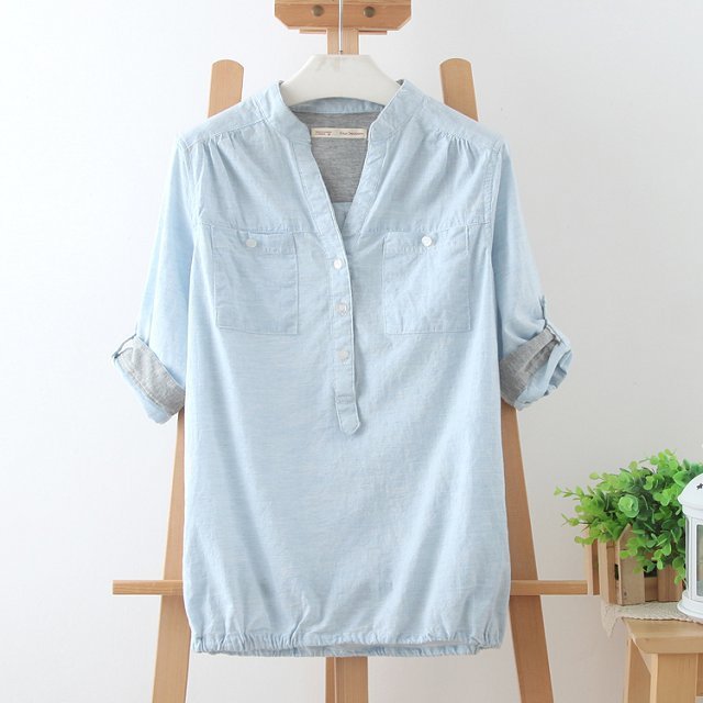 2015夏女士襯衫小清新松緊腰七分中袖v領(lǐng)襯衣雙口袋短款棉麻上衣 /