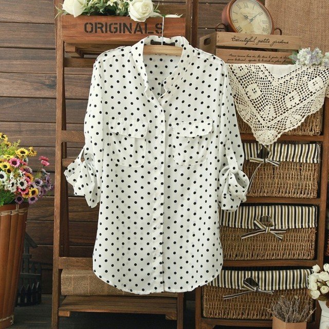 2015夏新款高圓圓同款圓點(diǎn)雪紡襯衫韓版顯瘦立領(lǐng)長袖波點(diǎn)女式襯衣 /