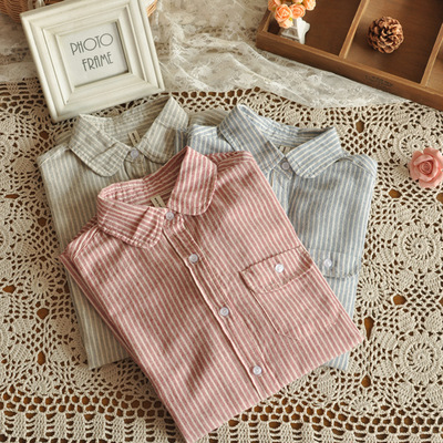 2015秋裝新款 日系小清新 韓國條紋口袋翻領(lǐng) 長袖襯衫 棉麻女襯衣 /