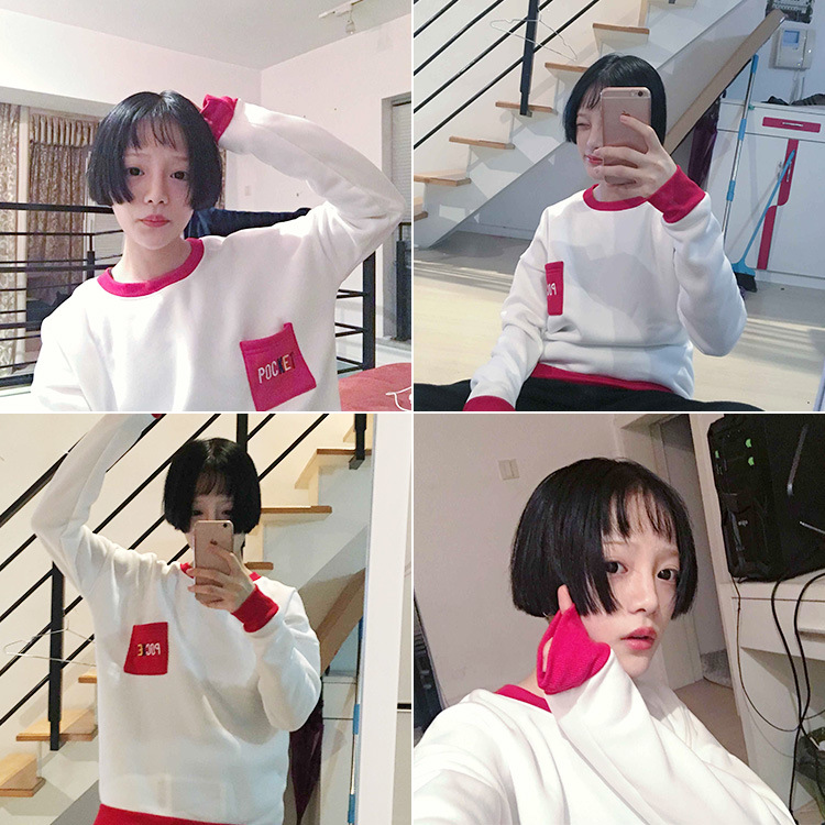 2015秋冬新款女裝韓版寬松顯瘦拼色圓領(lǐng)口袋刺繡長袖加絨衛(wèi)衣女 /