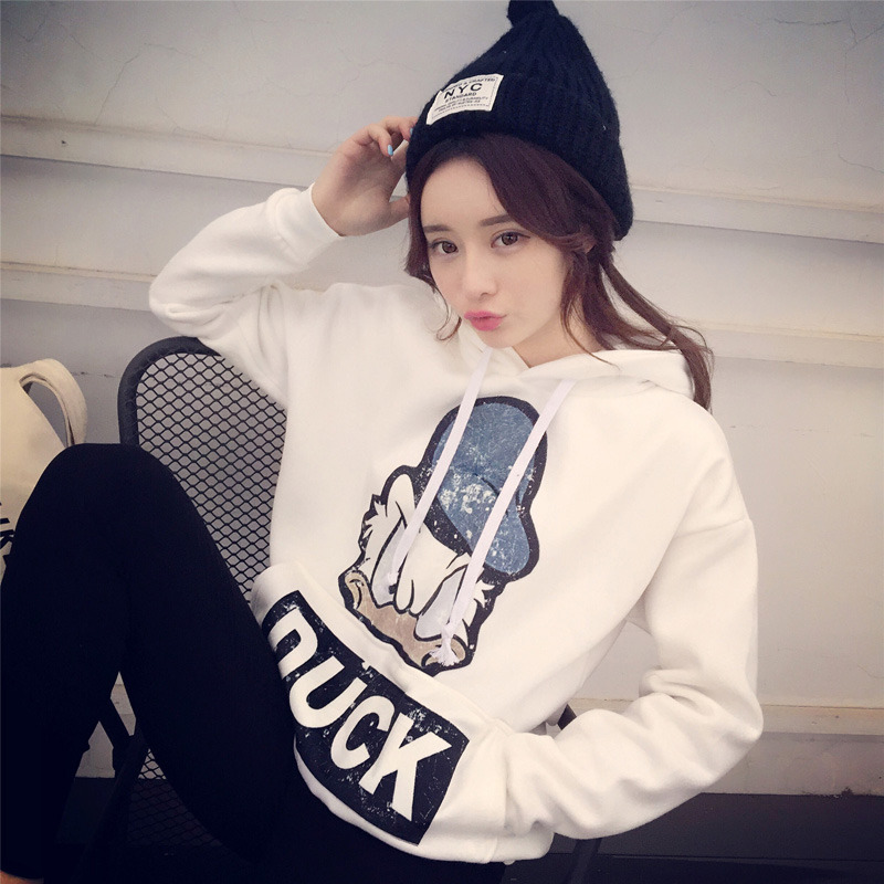 2015秋冬新款女裝韓版寬松大碼卡通鴨子字母印花長袖加絨衛(wèi)衣女 /