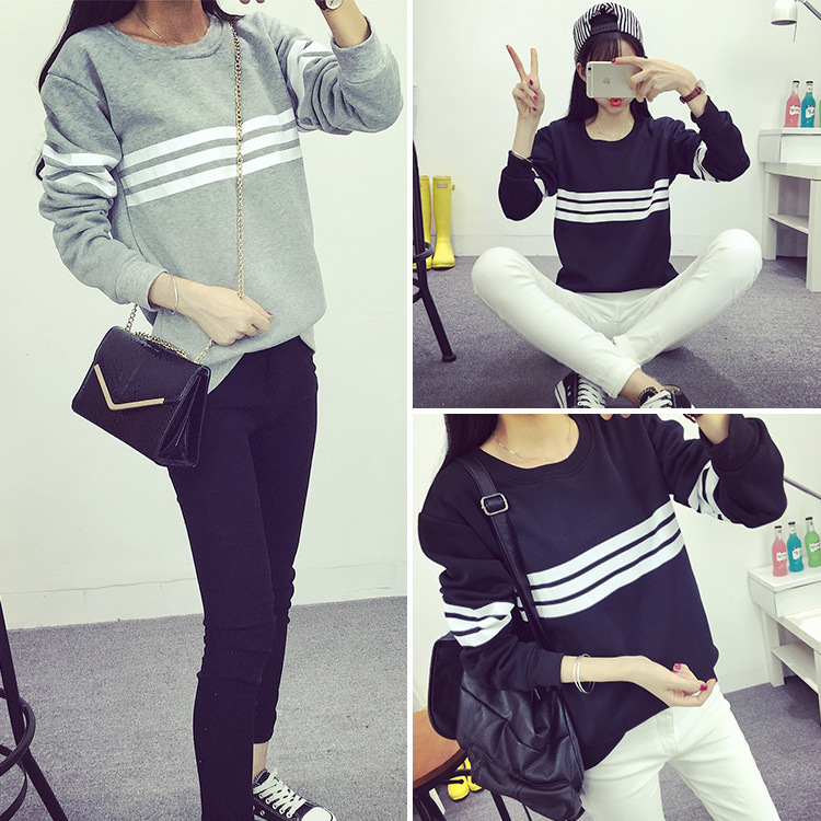 秋冬新款韓版原宿風條紋三條杠寬松加絨套頭衛(wèi)衣打底衫女閨蜜裝 /