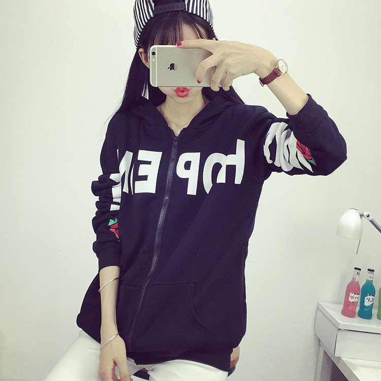 歐洲站秋冬新款韓版學生裝玫瑰字母印花加絨長袖開衫外套百搭衛(wèi)衣 /