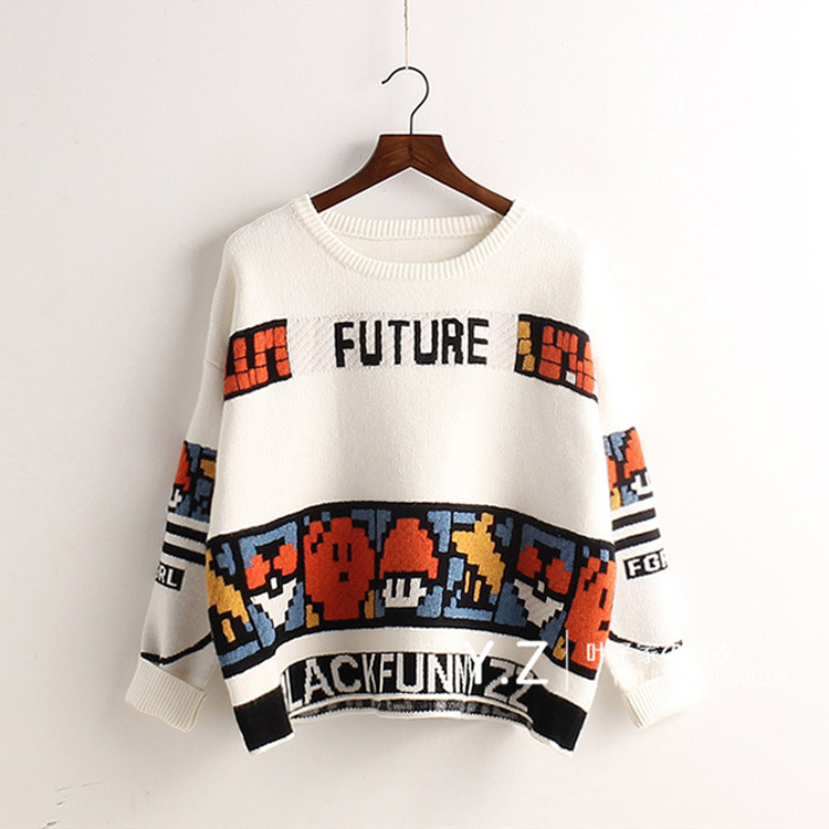 森女文藝卡通小倉(cāng)鼠印花針織衫 秋冬女式圓領(lǐng)羊毛套頭毛衣上衣 /