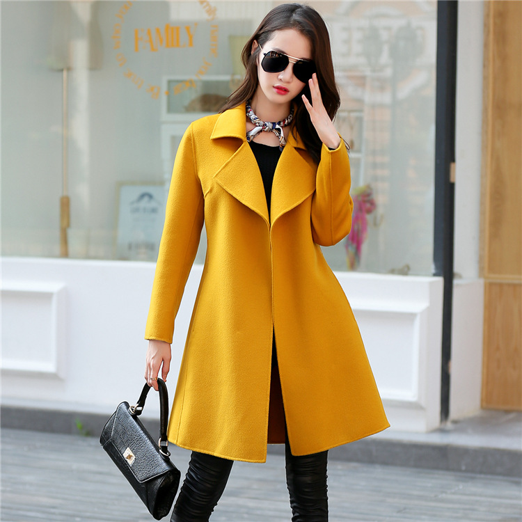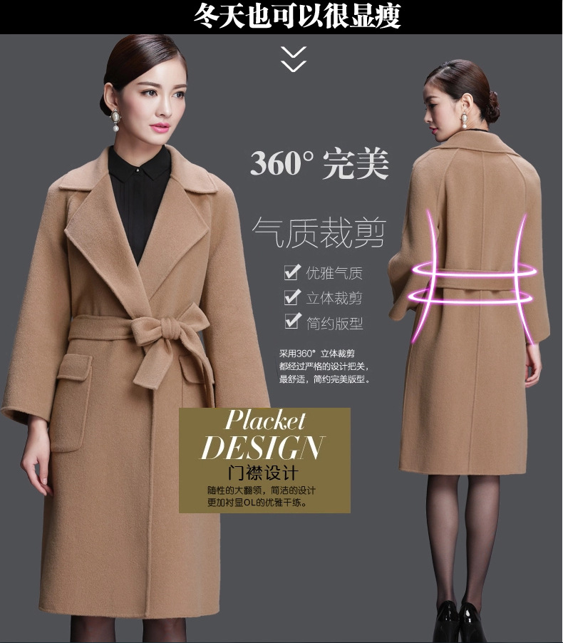 秋冬新款歐美大牌手工雙面呢大衣女 高端長款翻領(lǐng)修身呢外套 /