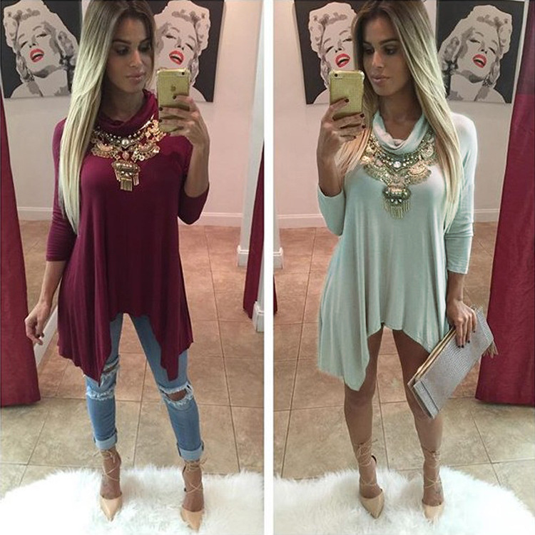 2015秋季新品女裝歐美圍巾領長袖不規(guī)則下擺上衣T恤 /