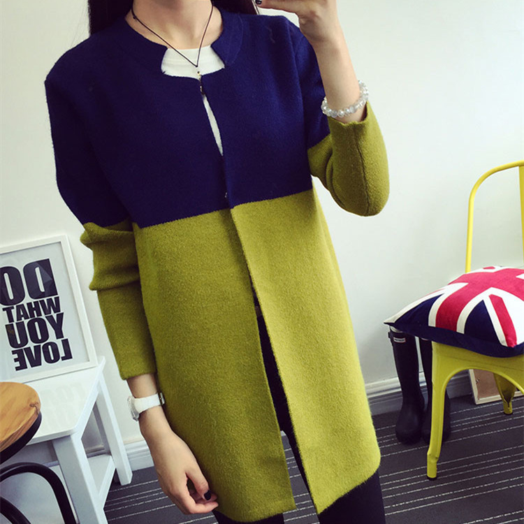 2015秋裝外套韓版復古拼接撞色毛衣外套修身中長款針織衫女開衫潮 /