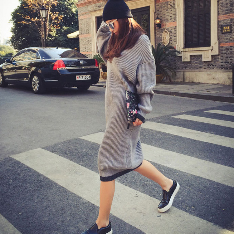 秋冬新款韓版加厚加長款毛衣裙女寬松打底衫套頭超長款針織連衣裙 /