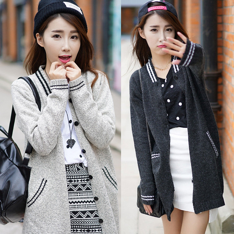 2015春秋冬新款針織毛衣開衫女裝純色棒球服學院風中長款外套批發(fā) /