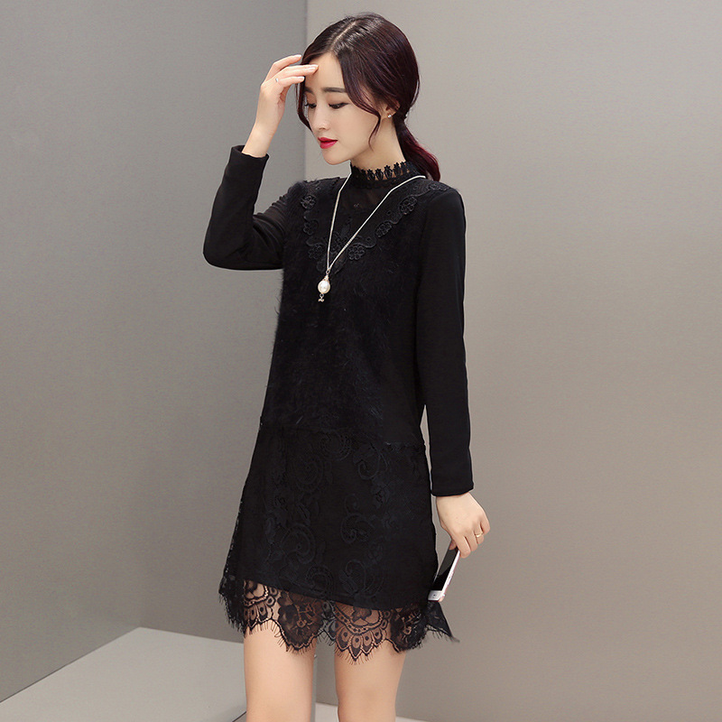 中長款蕾絲加絨打底衫2015秋冬新款韓版針織拼接蕾絲衫女長袖上衣 /