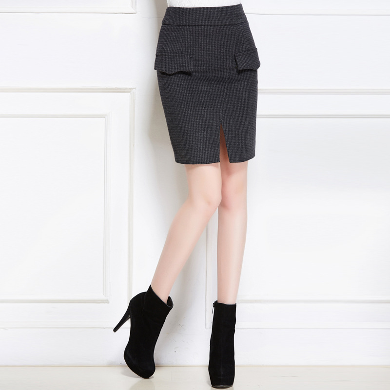 2015秋冬新款歐美百搭前開叉細(xì)格紋毛呢半身裙 顯瘦短裙包臀裙女 /