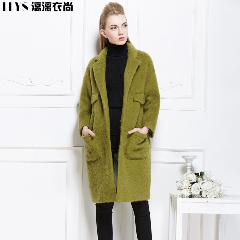 2015新款歐美大牌時尚芥末綠落肩拉毛毛呢大衣 羊毛女式風(fēng)衣批發(fā) /
