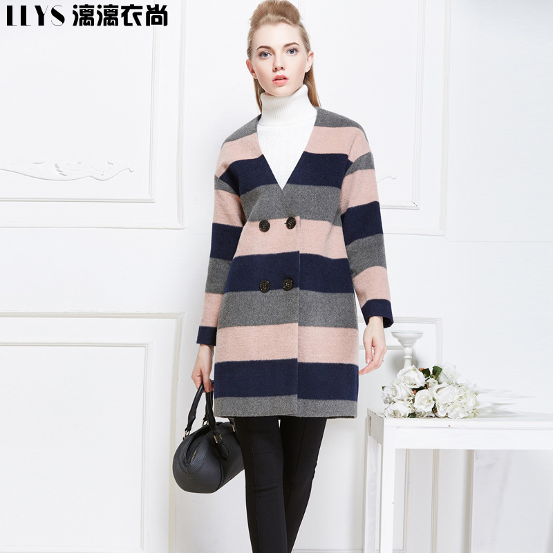 漓漓衣尚2015秋裝三色條紋V領(lǐng)毛呢外套 雙排扣長款修身女式風(fēng)衣 /