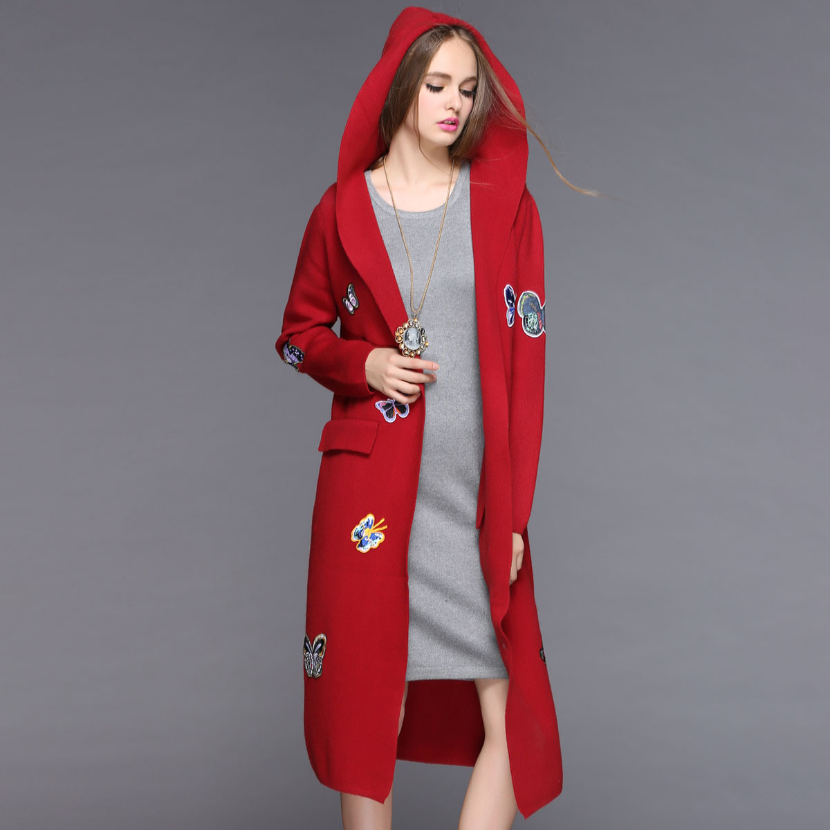 2015冬季新款女裝 蝴蝶刺繡貼花外套 歐美時(shí)尚加長(zhǎng)貂絨連帽大衣女 /