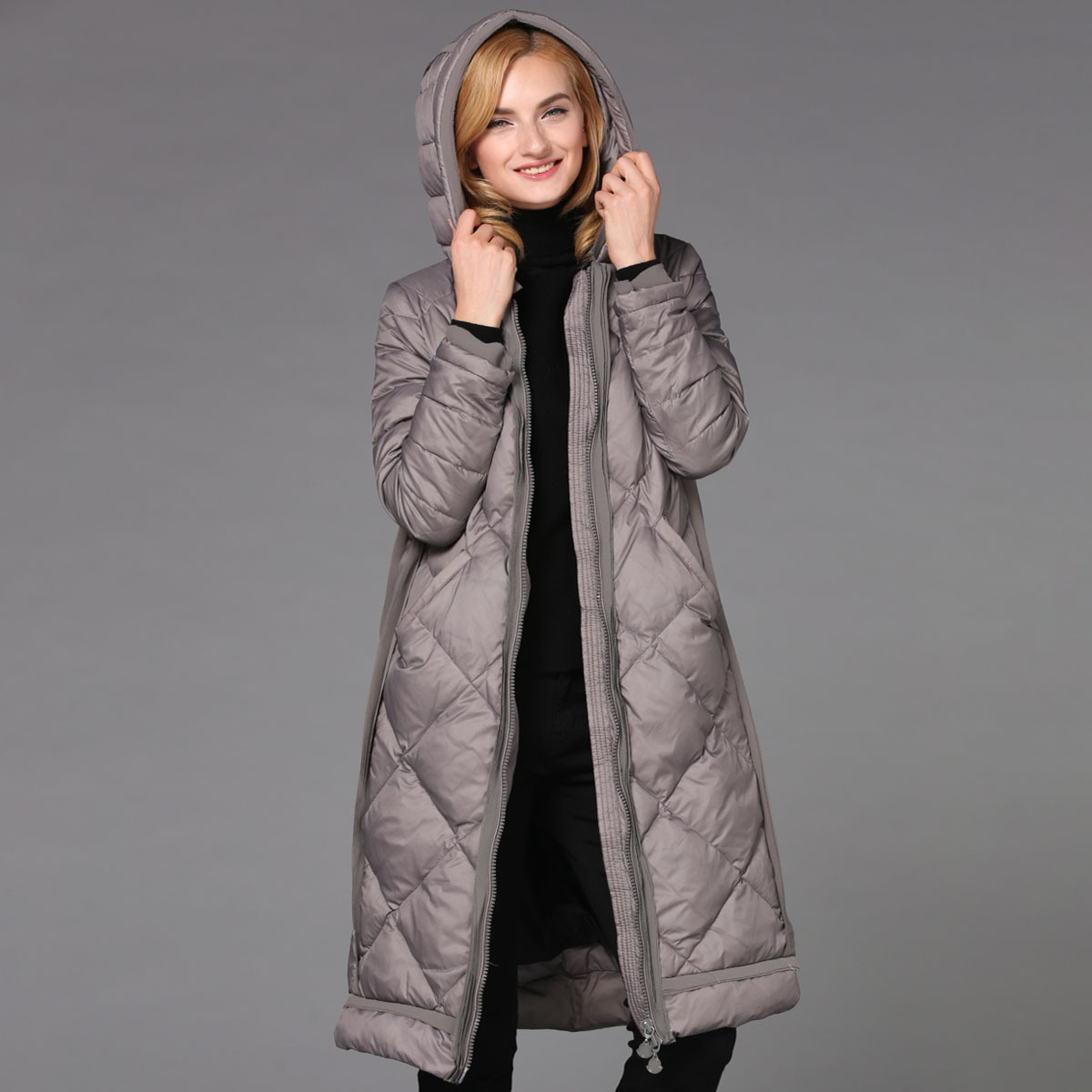 歐洲站2015冬季歐美女裝羽絨服 加長(zhǎng)款白鴨絨連帽羽絨服外套修身 /