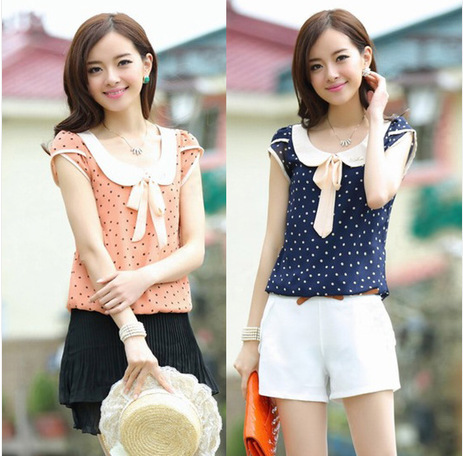 修身雪紡衫娃娃領(lǐng)短袖T恤 女襯衫上衣波圓點(diǎn)淑女短袖 /