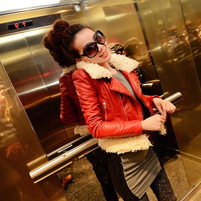 2015冬季新款韓版修身加厚PU皮衣 時(shí)尚百搭氣質(zhì)紅色皮衣外套 /