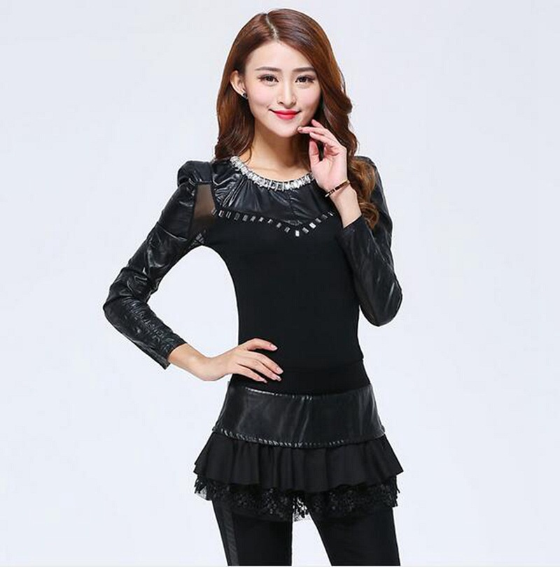 2015秋冬女式新款打底褲韓版蕾絲PU加絨加厚假兩件套拼皮休閑褲裙 /