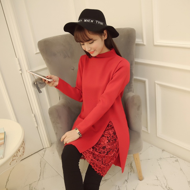 2015秋冬活動新款女裝長袖圓領(lǐng)側(cè)面蕾絲開叉中長款兔毛純色毛衣 /