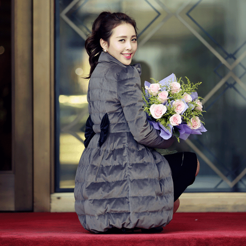 冬季韓版大碼棉衣女胖mm蝴蝶結(jié)加厚金絲絨手塞棉羽絨服中長外套 /