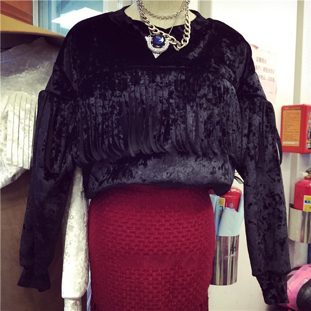 2015秋冬新品實拍韓版女裝復(fù)合燈芯絨流蘇圓領(lǐng)長袖衛(wèi)衣女打底衫 /