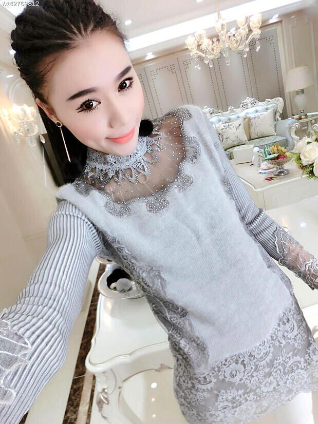 歐洲站秋冬新款袖口繡花胸前燙鉆拼接水貂絨中長(zhǎng)款蕾絲打底衫 /