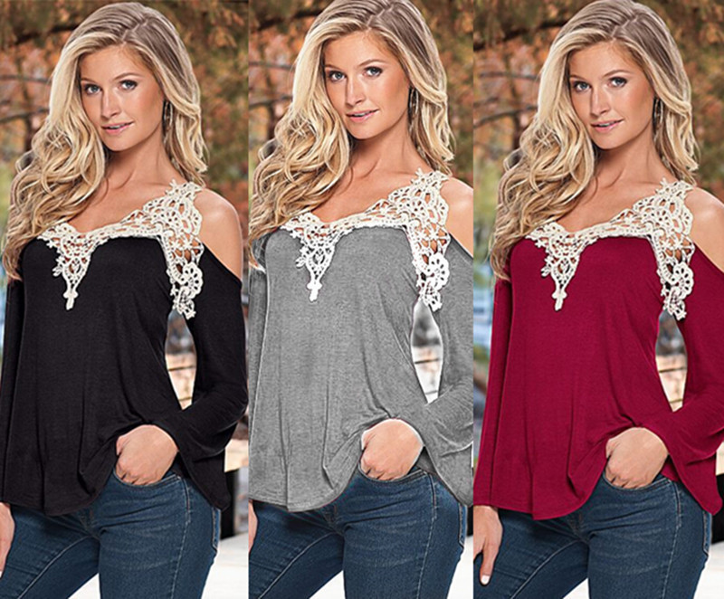 速賣通ebay2015歐美爆款 蕾絲花邊拼接性感v領(lǐng)長(zhǎng)袖露肩上衣吊帶 /
