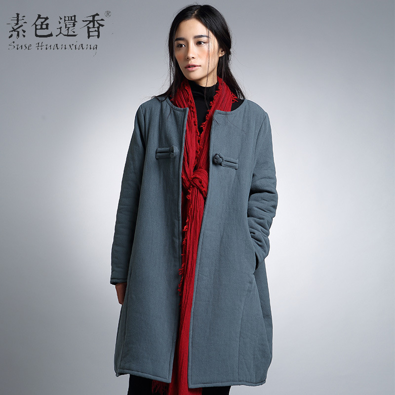 2015秋冬新款呢大衣女外套加厚中長款保暖棉衣純色風(fēng)衣文藝盤扣 /