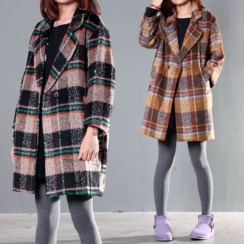 原創(chuàng)大碼女裝秋冬裝新款呢料外套韓版學(xué)院風(fēng)大格子休閑毛呢大衣女 /