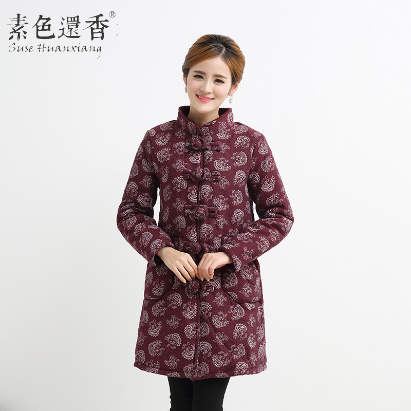 2015新款大碼民族風(fēng)女裝冬裝棉衣棉服中式棉麻印花中長款棉襖外套 /