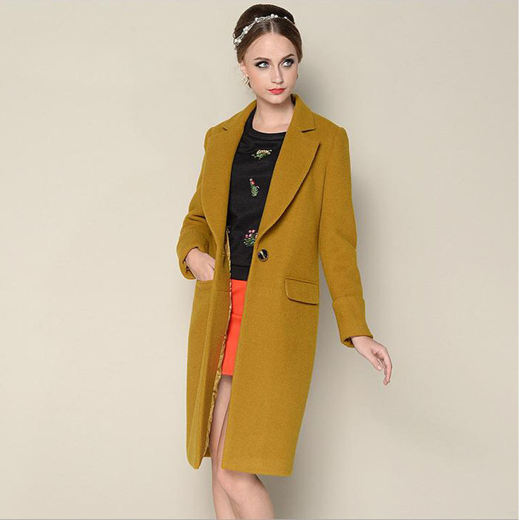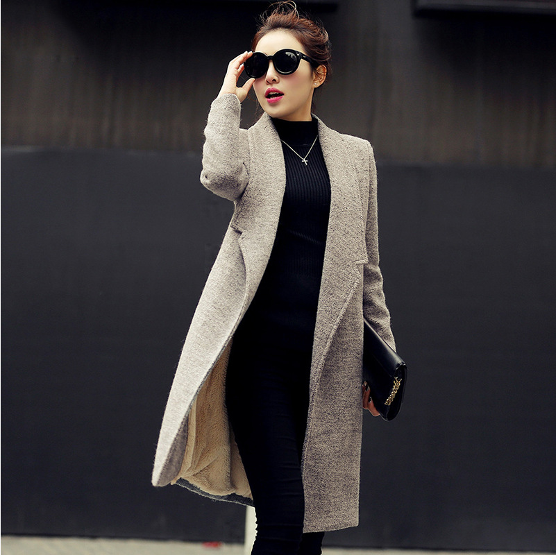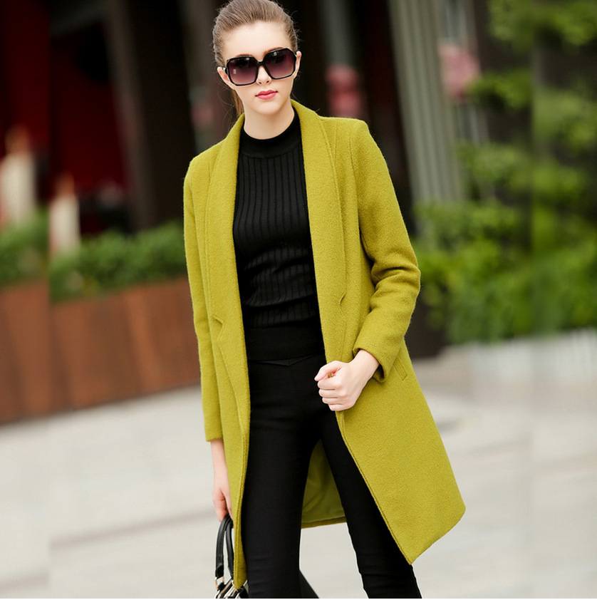 歐洲站2015冬季新品女裝歐美羊毛呢子百搭加厚中長款修身外套 /