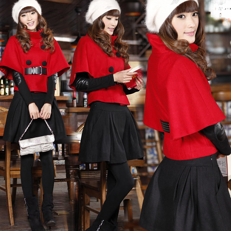 2015新款秋冬季裝韓版斗篷式毛呢短外套加半身裙加腰帶兩件套裝女 /